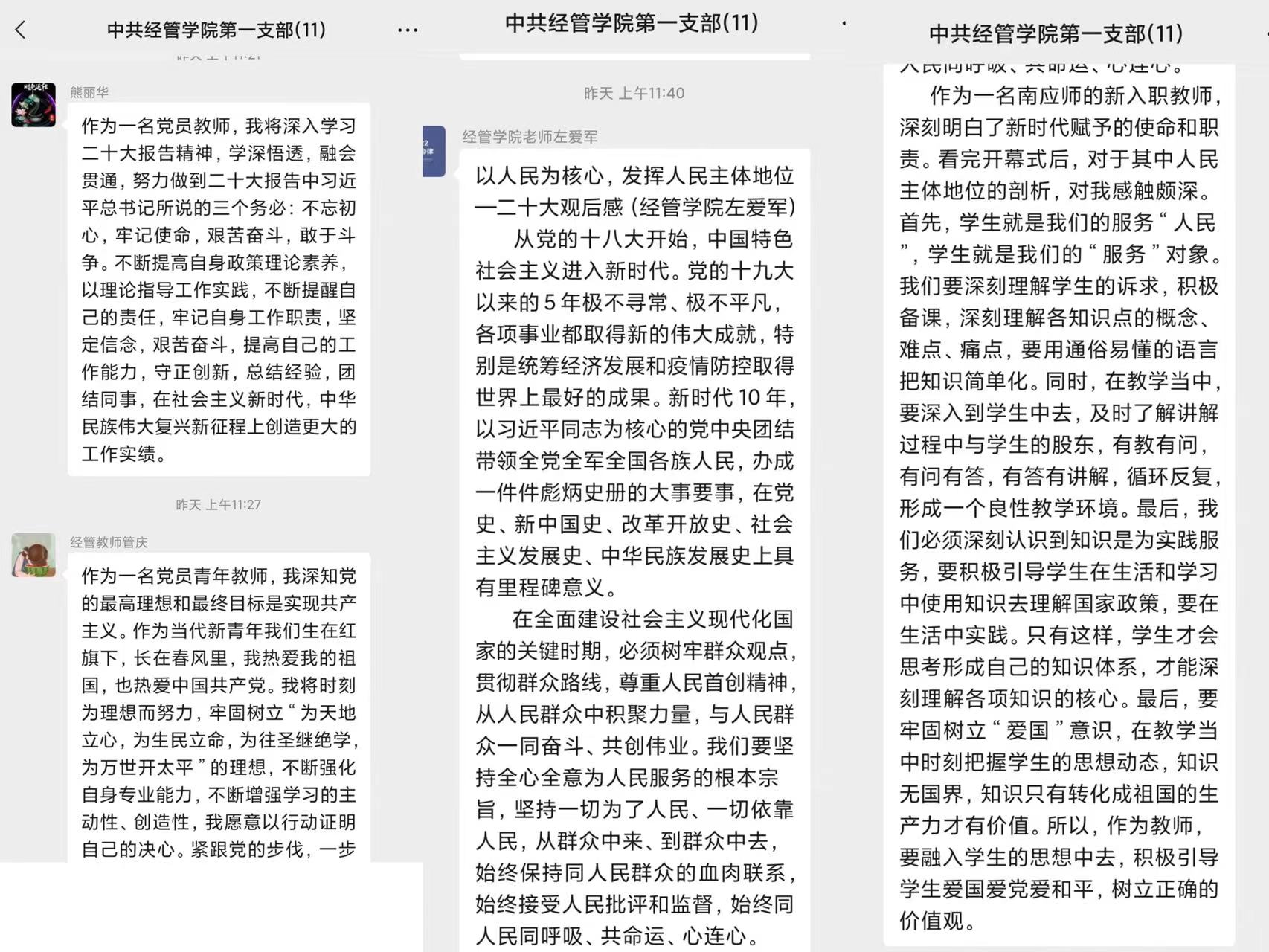 观看之后,党员同志们纷纷发表感言表示:作为新时代的教师应提高思想觉悟,提升创新精神,增强工作责任感,不断强化自身专业能力,争做“四有”好老师,将继续认真学习和总结党的二十大相关理论和精神,以课程思政促学院发展;在学院党总支的关怀指导下,不断提高思想政治站位,时刻团结在党中央周围,以习近平总书记新时代中国特色社会主义思想为指导,同心同德,奋发进取,以专业特色创建党建品牌,提升师生身心素质发展,继续为学校改革发展献言献策,敢作敢为地为全面建设社会主义现代化强国贡献自己的力量!