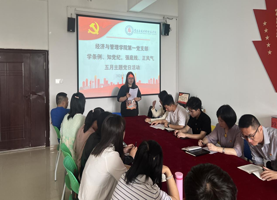 为深入推进党纪学习教育,激励党员始终坚定理想信念、增强党性修养、奋发实干作为,beat365第一党支部于2024年5月20日在1207党员活动室开展以“学条例、知党纪,强底线、正风气”为主题的党日活动。会议由支部书记朱红梅主持,全体党员参会。