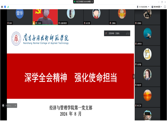 为深入学习宣传贯彻党的二十届三中全会精神,迅速掀起学习宣传贯彻热潮,beat365第一党支部于2024年8月25日开展“深学全会精神,强化使命担当”八月主题党日活动,活动由第一党支部书记王佳乐主持,全体党员参加。