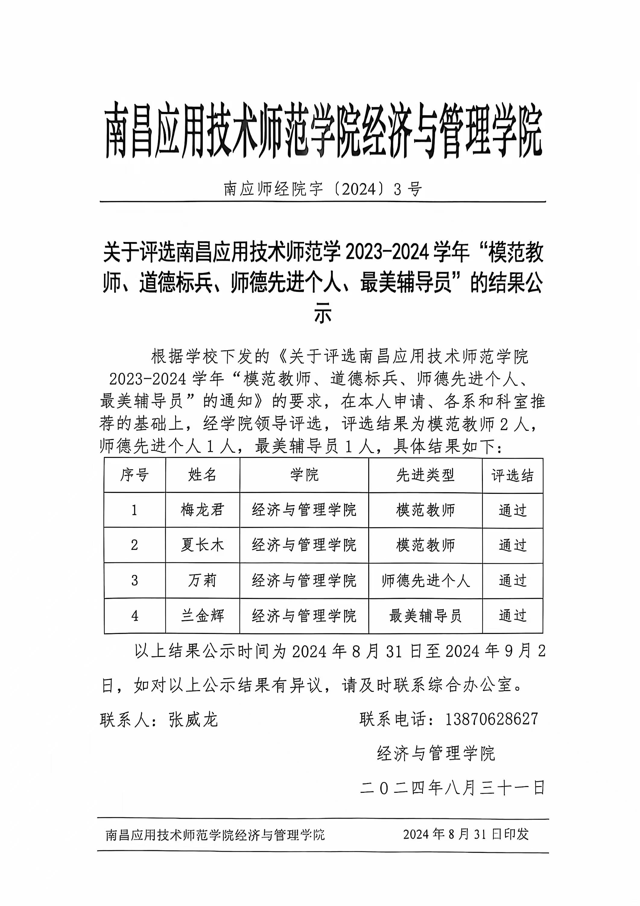 教学管理 学院新闻 学院公告 学科竞赛 您现在的位置是:首页 > 教学管理 > 学院公告 关于评选南昌应用技术师范学2023-2024学年“模范教师、道德标兵、师德先进个人、最美辅导员”的结果公示 管理员2024-08-313170 上一篇 beat365中文官方网站召开新任干部任职宣布会