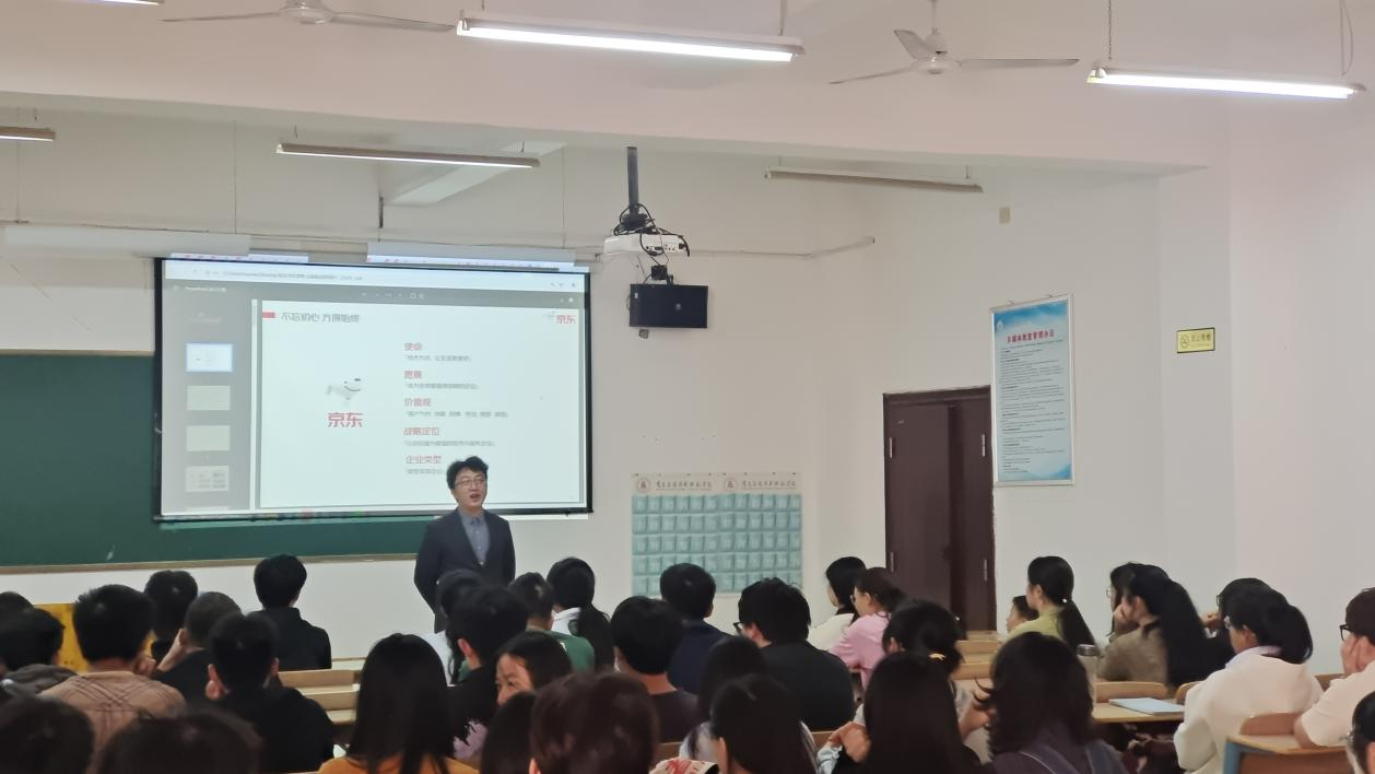 宣讲会现场,京东集团零售客户体验与服务部主管杜宇凡详细介绍了公司的企业文化、发展历程、业务领域以及未来的战略规划。同时,针对经济管理类专业的特点,招聘方还重点介绍了财务、供应链管理、市场营销等多个领域的招聘岗位,以及这些岗位的职业发展路径和晋升空间。
