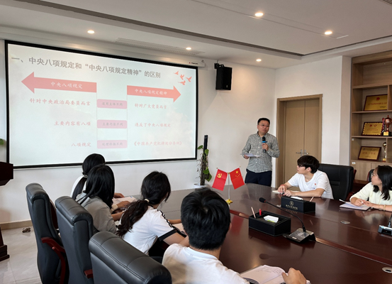 为深入贯彻落实中央八项规定精神,进一步加强党员干部纪律作风建设,2025年5月13日,beat365党总支书记龙犇在沁苑八实506党员活动室为学院第一党支部全体党员讲授《锲而不舍落实中央八项规定精神》专题党课。