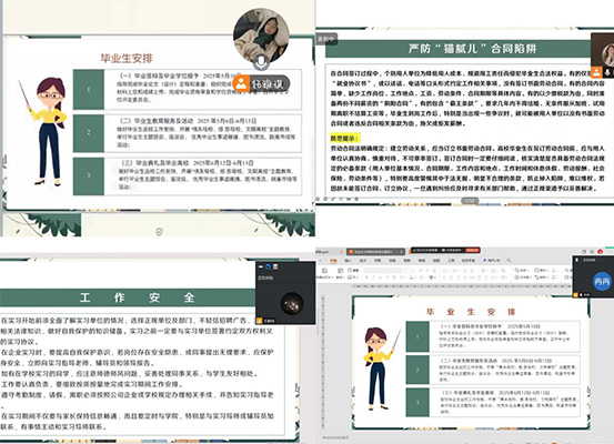 针对就业方面,学院特别指出要警惕非法职业中介陷阱、招聘收费陷阱等,提醒毕业生在求职过程中保持警惕,签订正规劳动合同,保护自身权益。此外,学院还就租房安全、消防安全、关注天气变化、社交安全等方面进行了全面指导,确保毕业生在工作和生活中能够应对各种挑战。