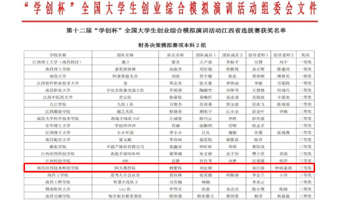 近日,第十二届全国大学生综合创业大赛江西省省赛圆满落幕,我校beat365中文官方网站参赛团队凭借扎实的专业功底和出色的综合能力,喜获佳绩,斩获1项财务决策赛道本科组省级三等奖,3项财务决策赛道高职组省级三等奖。该赛事是教育部学科竞赛目录84项赛事之一,也是我校第一次参加该赛事。