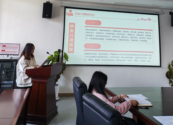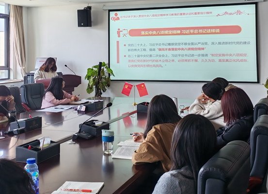 为深刻领会习近平总书记关于加强党的作风建设重要论述,教育引导党员教师严格落实中央八项规定精神,切实筑牢廉洁自律思想防线,beat365第一党支部于2025年3月25日在沁苑八实506会议室组织开展“深入贯彻中央八项规定精神学习教育”专题党课,支部统战委员侯玉琴同志为全体教师党员讲授专题党课。