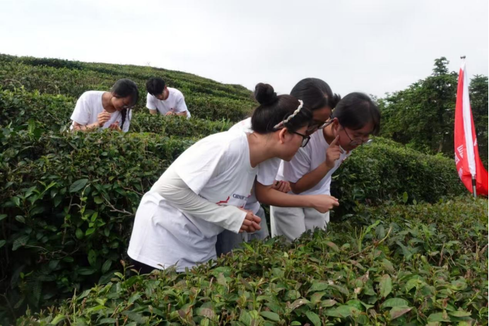 在茶园技术负责人的引导下,实践队员们步入连绵起伏的生态茶园。队员们穿行于翠绿茶垄间,亲手触摸鲜嫩茶芽,感受着叶片蓬勃的生命力。负责人现场讲解茶树品种特性与绿色生态种植理念,让书本上的知识瞬间变得立体而生动。沉浸式的体验,让同学们对茶产业的根基有了最直观的认知。