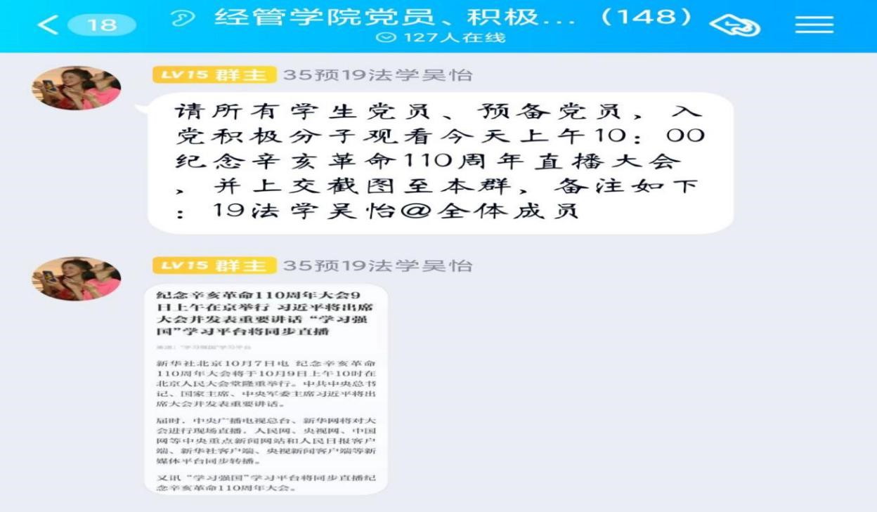各位党员、预备党员和入党积极分子通过观看纪念辛亥革命110周年大会直播,缅怀孙中山先生等革命先驱的历史功勋,就是要学习和弘扬他们为振兴中华而矢志不渝的崇高精神,激励和团结海内外全体中华儿女为实现中华民族伟大复兴而共同奋斗。同时,深刻认识到“我们这一代人,将继承先辈穷其一生为国为民上下求索的精神,响应并秉持习近平总书记‘海内外全体中华儿女更加紧密地团结起来,发扬孙中山先生等辛亥革命先驱的伟大精神,携手向着中华民族伟大复兴的目标继续奋勇前进’的号召,同心同德,砥砺前行。”