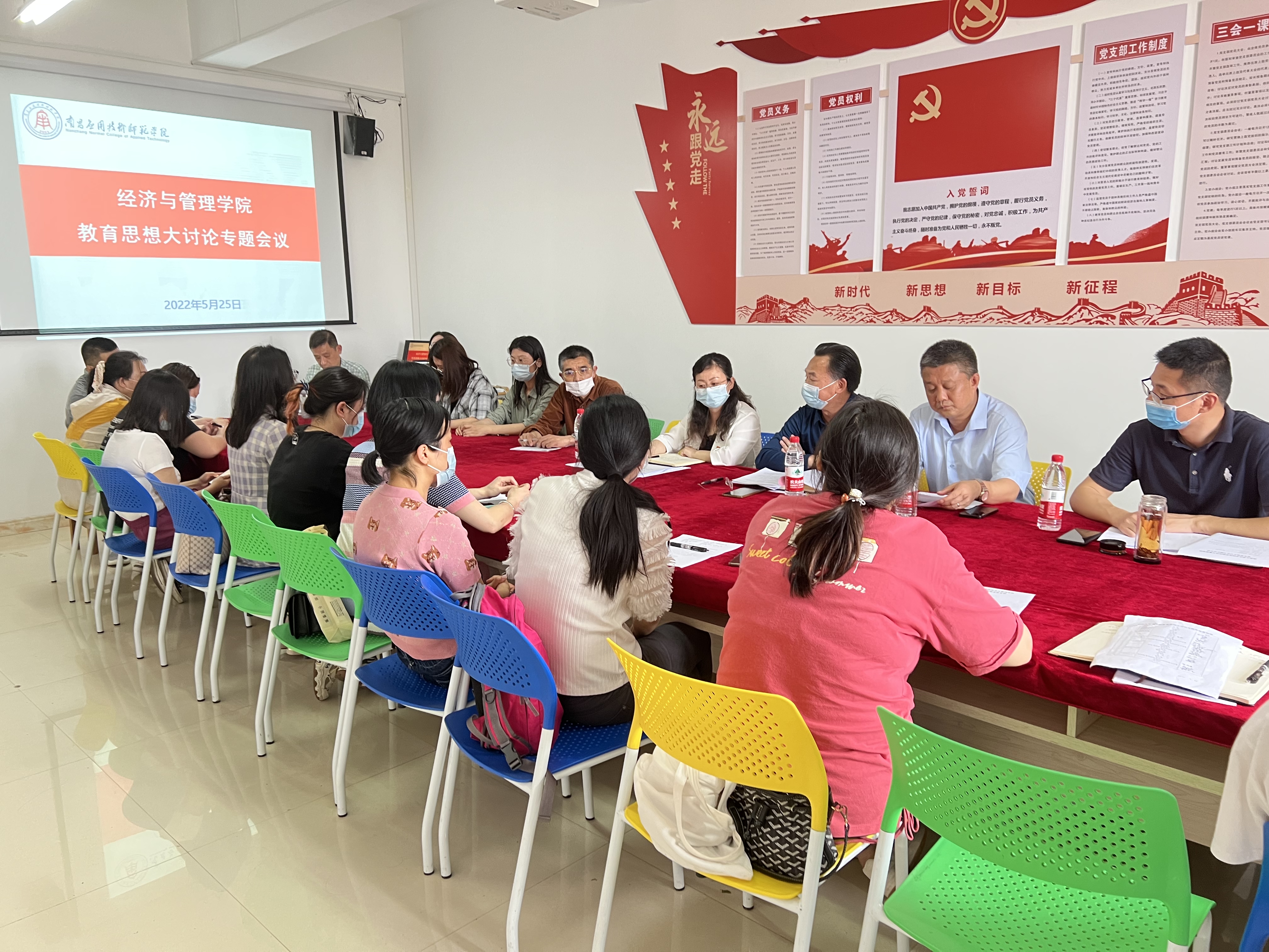 为认真学习贯彻《易炼红同志在省委教育工作领导小组2022年第一次全体会议上的讲话》精神和深入贯彻落实《beat365中文官方网站教育思想大讨论实施方案》的工作要求及有关文件精神,beat365中文官方网站于2022年5月25日下午14:00,在教学楼1207会议室召开beat365中文官方网站教育思想大讨论专题会议,会议采取线下和腾讯会议形式召开,会议由学院党总支书记王颖主持,校长助理黄国清出席会议,经管学院全体教职工参加会议。